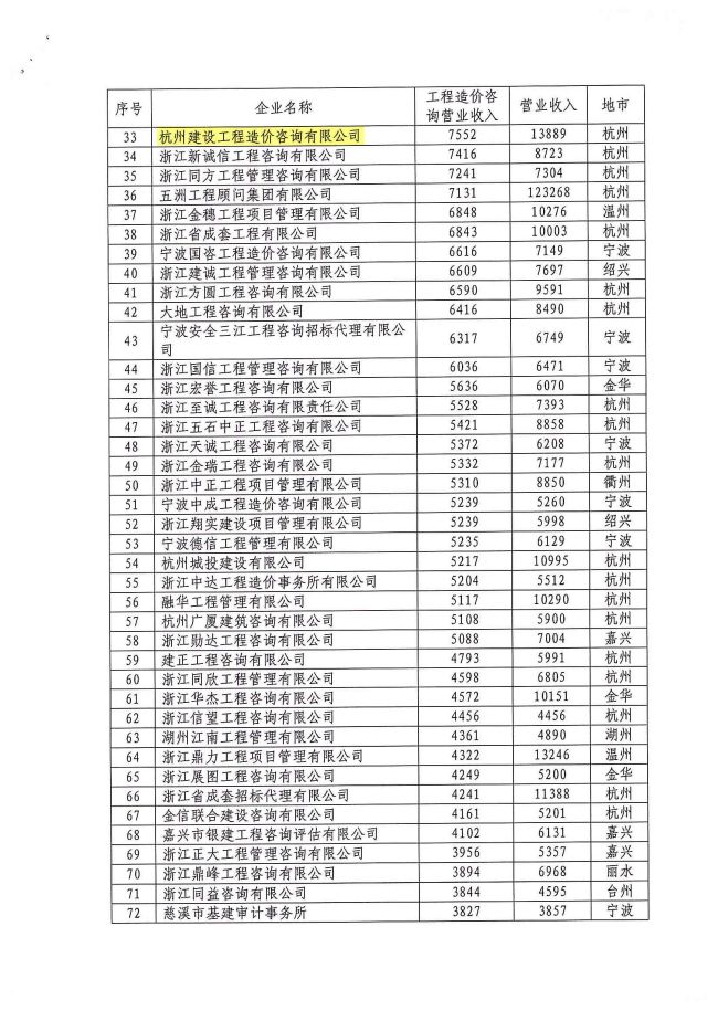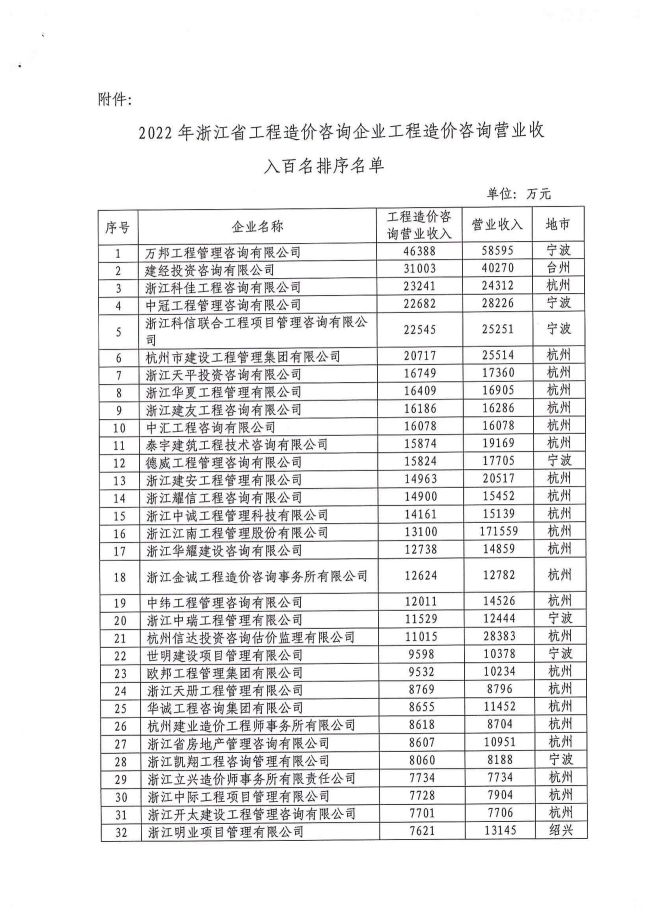 2022年浙江省工程造价咨询企业工程造价咨询营业收入百名